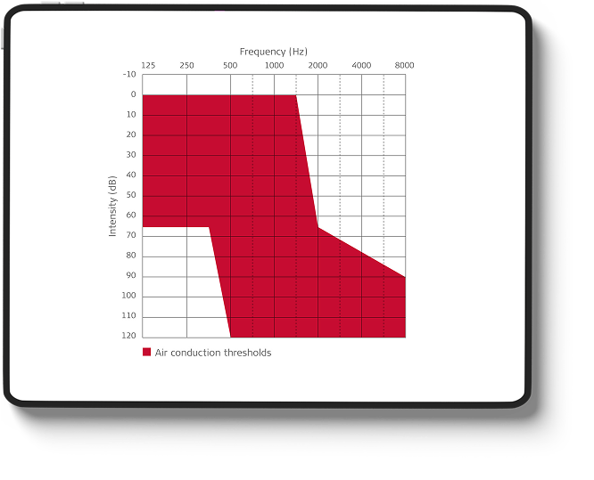 - Drop in the high-frequency range from approximately 1500 Hz (air conduction hearing thresholds). See the area marked in red in the diagram.