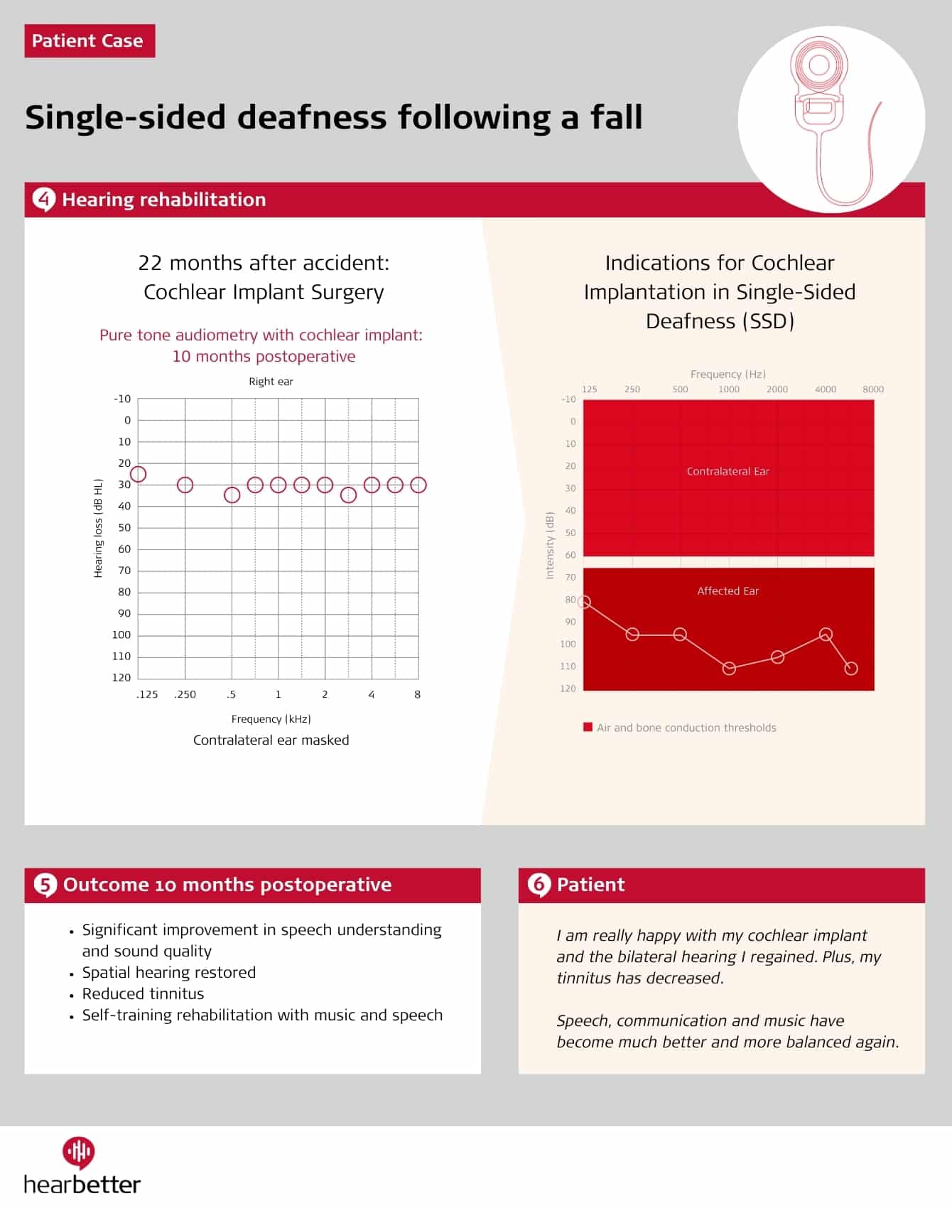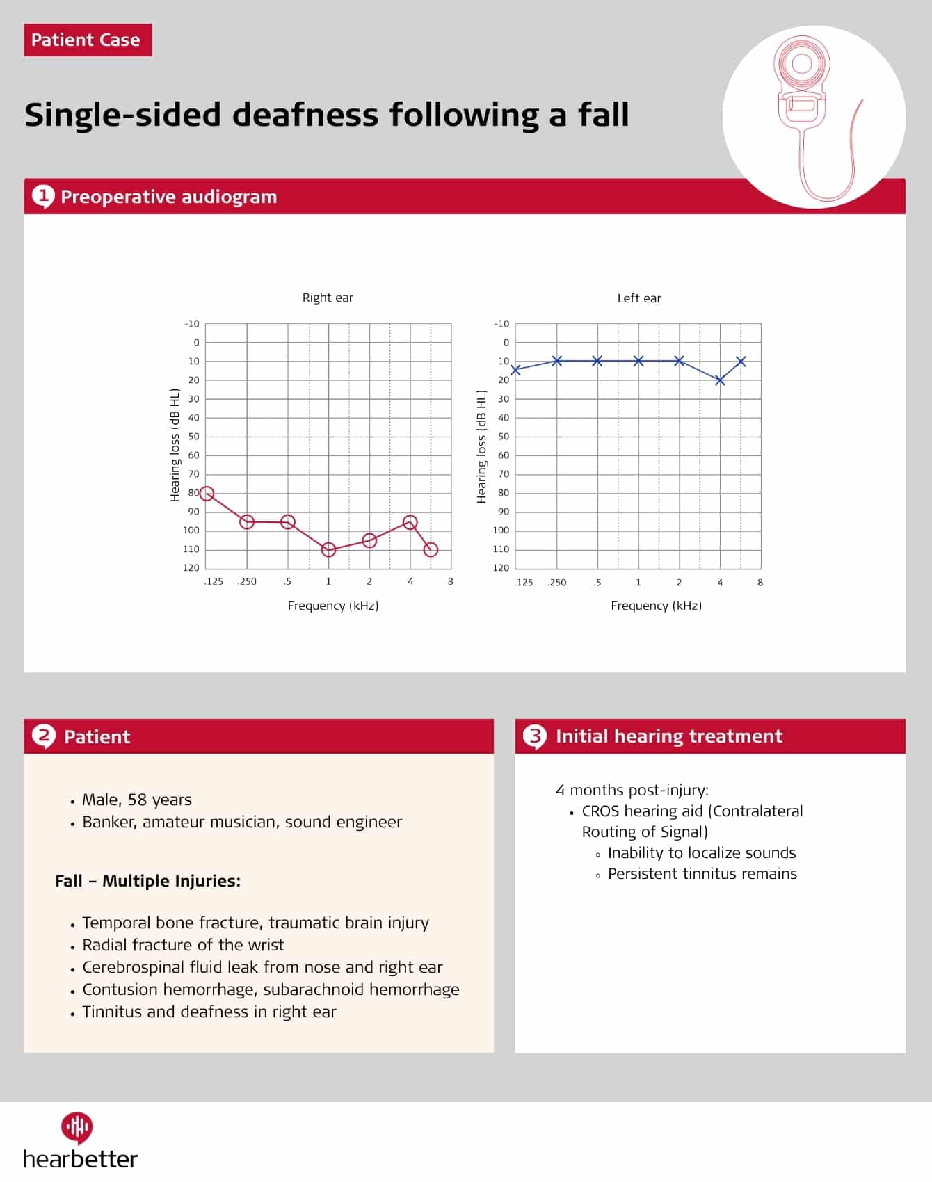 Following an accident, a patient loses hearing in one ear. Despite his CROS system, spatial hearing and sound quality remain unsatisfactory, affecting both his professional and personal quality of life.